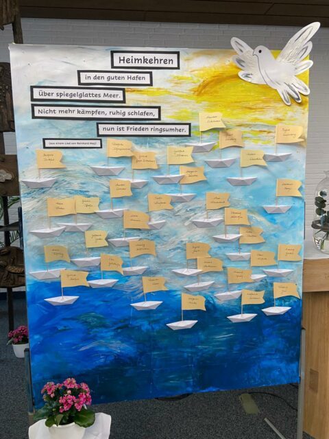 In diesem Jahr war der Leitgedanke unseres Gedenkgottesdienstes eine Liedzeile aus einem Lied von Reinhard Mey: „Heimkehren, in den sicheren Hafen über spiegelglattes Meer. Nicht mehr kämpfen, ruhig schlafen, nun ist Frieden ringsumher.“ Dazu stand im Blickfeld der Besucher eine Gestaltung, auf der jeder im Jahr 2025 verstorbene Bewohner mit seinem Namen erwähnt war. Bei der Nennung der Namen am Altar und des Entzünden eines Lichtes für jeden wurden die Verstorbenen einzeln in Erinnerung gerufen.